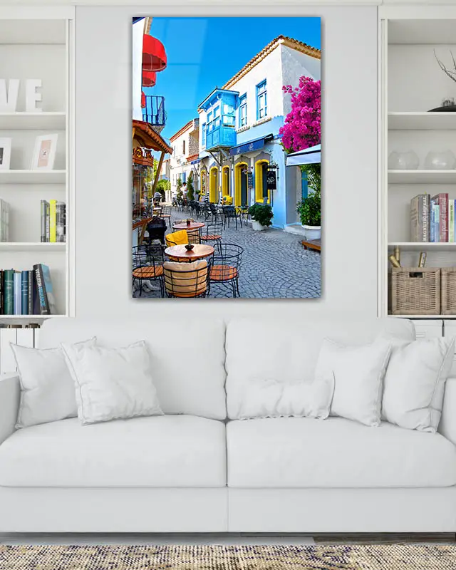 Alaçatı Sokaklarında Renkli Evler Temperli Cam Tablo