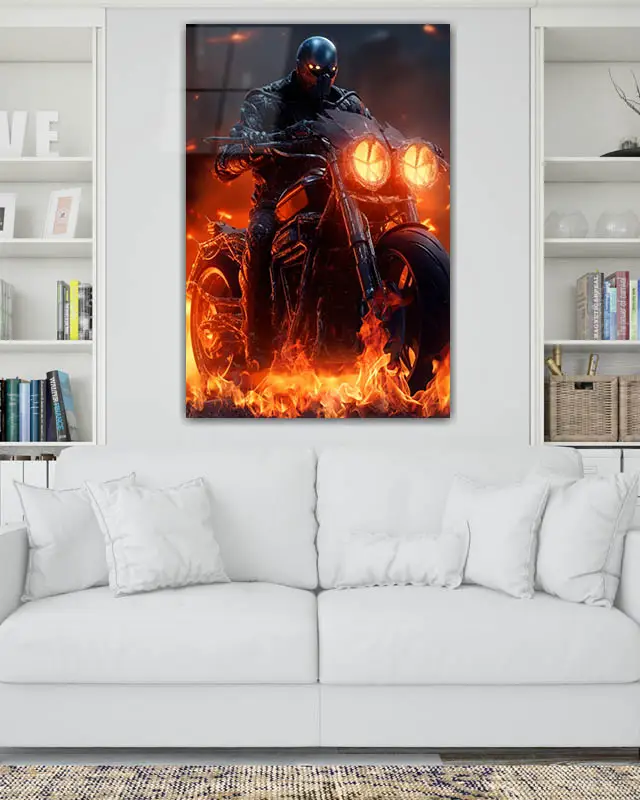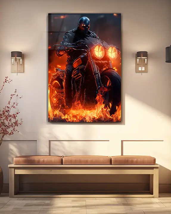 Alevler İçinde Siyah Motosiklet Sürücüsü Temperli Cam Tablo