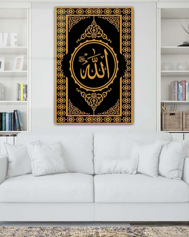 Allah Lafzı Yazılı Sarı Motifli Siyah Kırılmaz Temperli Cam Tablo