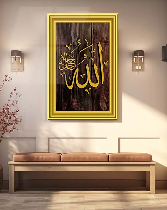 Altın Çerçeveli Ahşap Zeminli Muhammed Lafzı Kırılmaz Temperli Cam Tablo