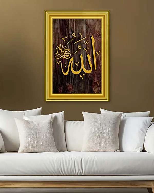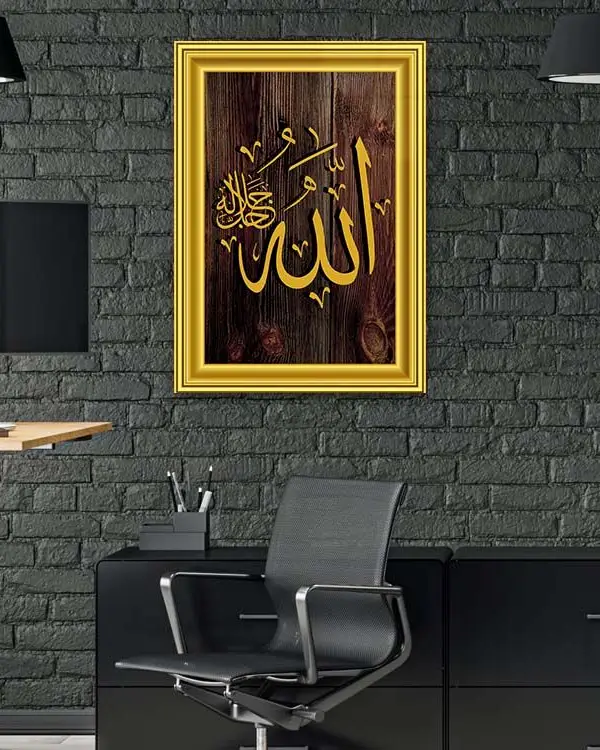 Altın Çerçeveli Ahşap Zeminli Allah Lafzı Kırılmaz Temperli Cam Tablo