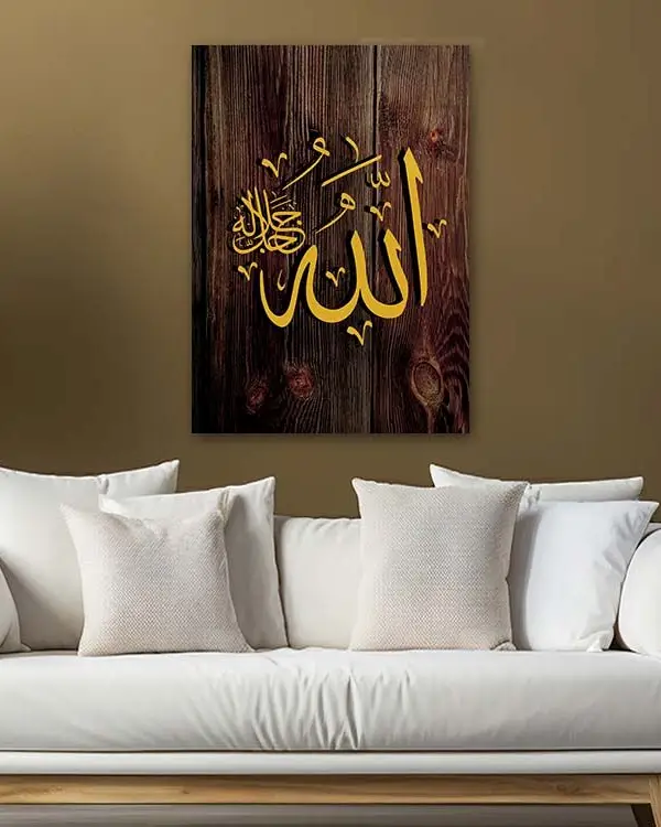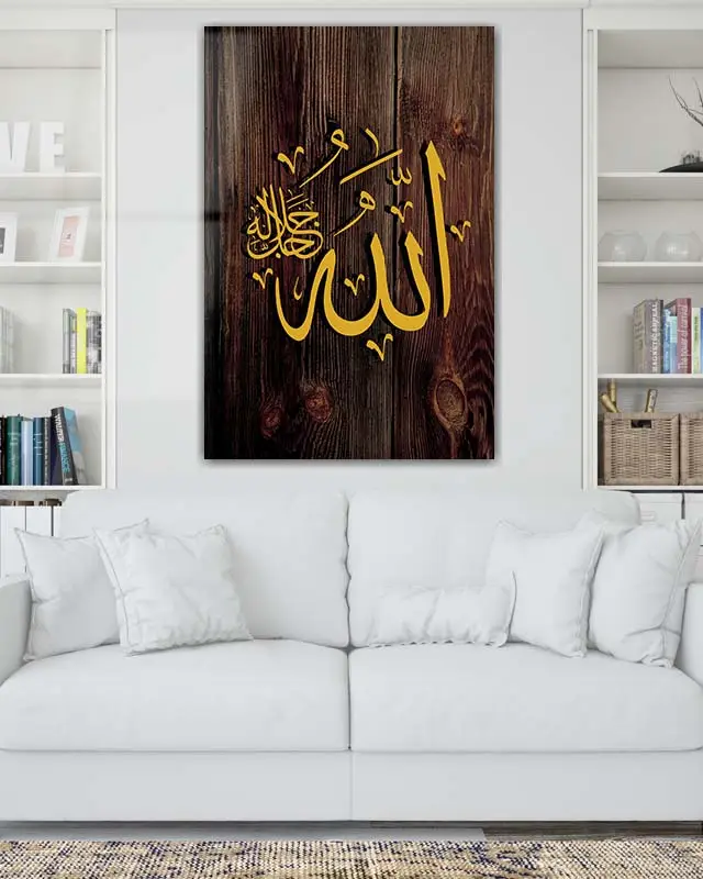 Altın Renkli Allah Lafzı Ahşap Zeminli Kırılmaz Temperli Cam Tablo