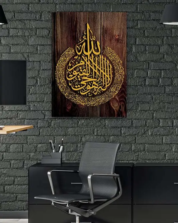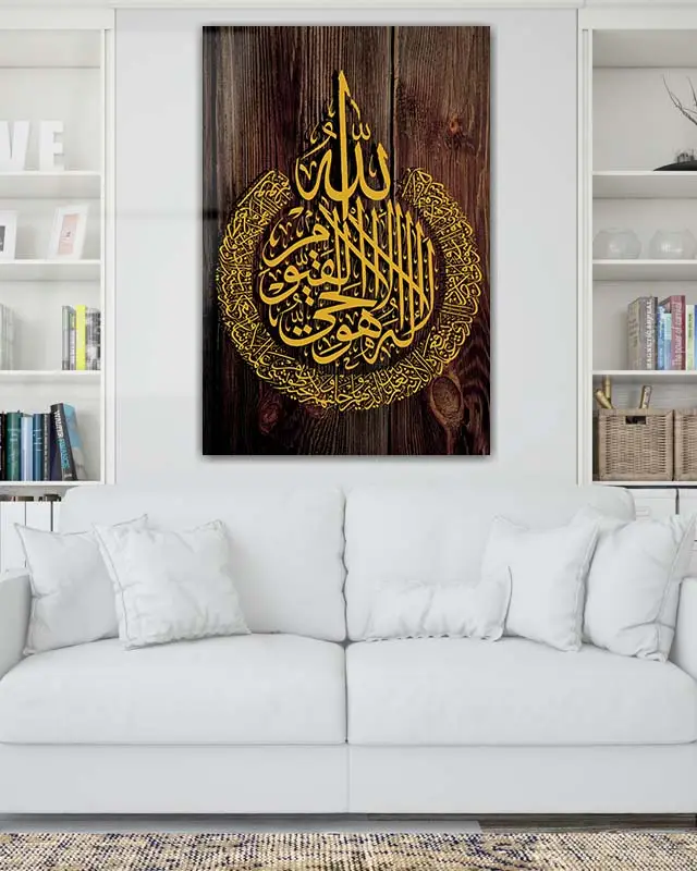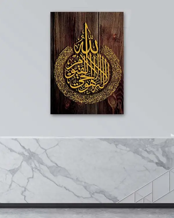 Altın Renkli Kelime-i Tevhid Ahşap Zeminli Kırılmaz Temperli Cam Tablo