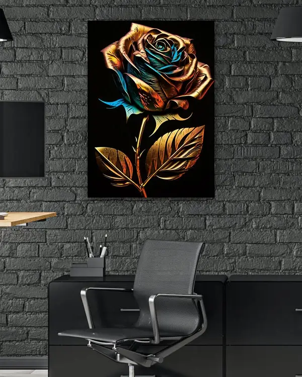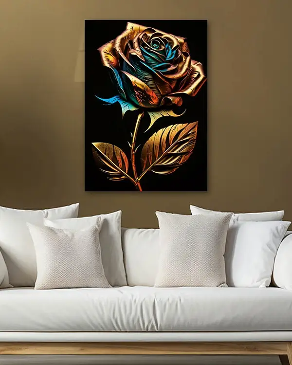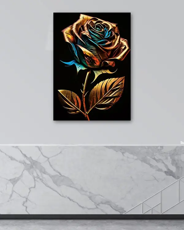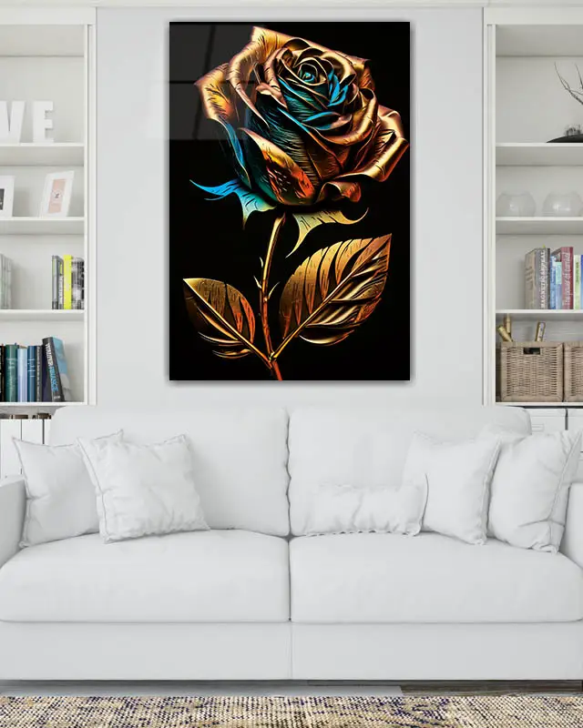 Altın ve Turkuaz Dokulu Gül Temperli Cam Tablo