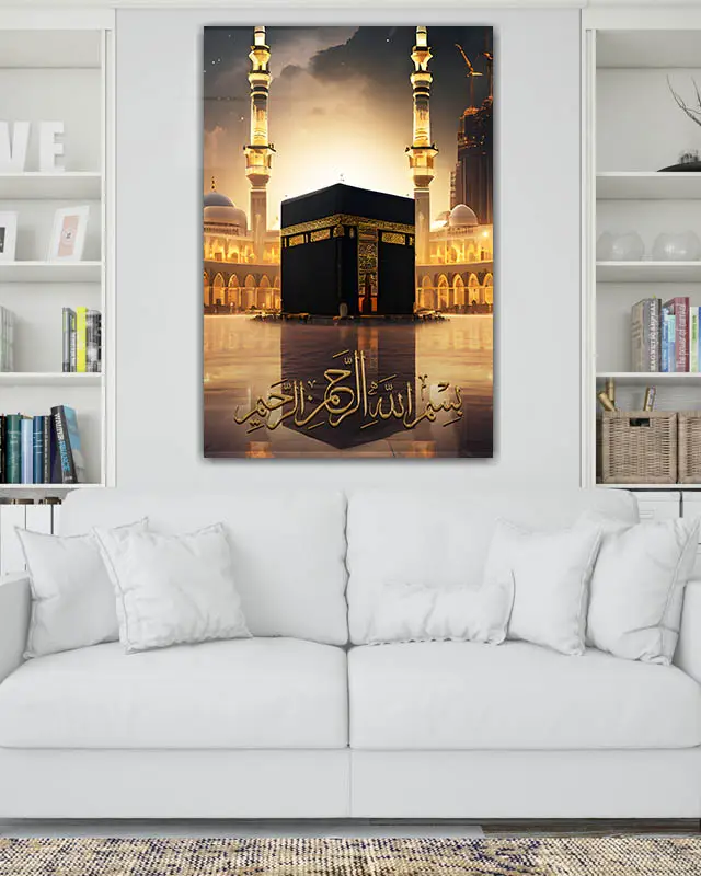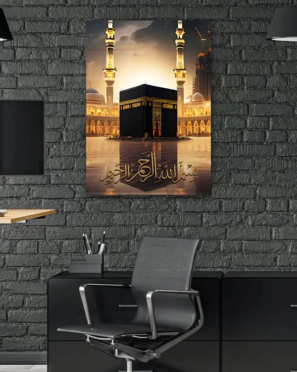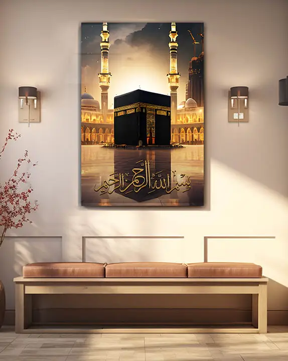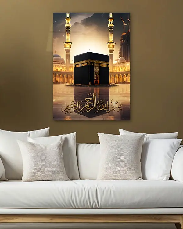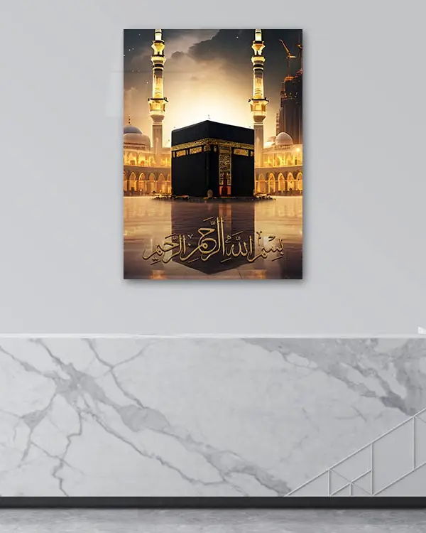 Bismillah Yazılı Kabe ve Mescid-i Haram Manzaralı Kırılmaz Temperli Cam Tablo