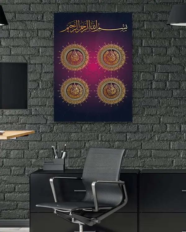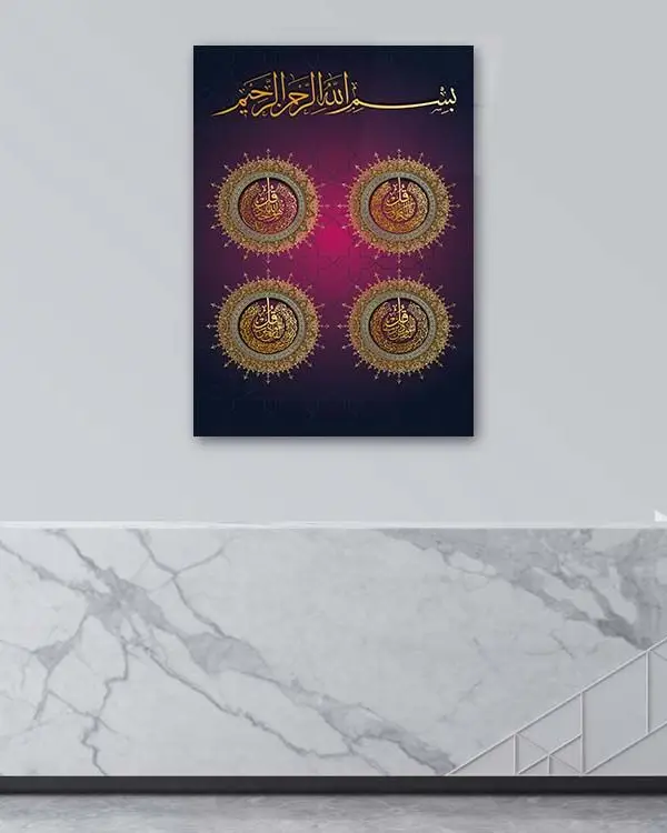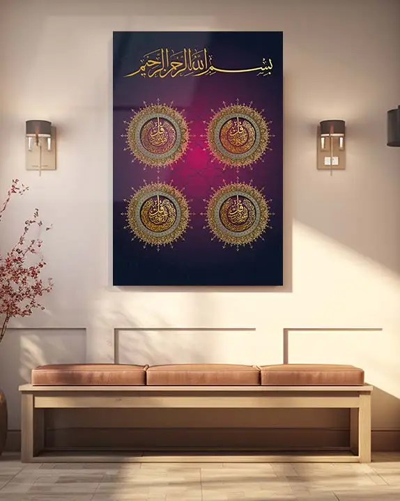 Bordo-Siyah Geçişli Zemin Üzerine Altın Hatlı Besmele ve Dört Halife Kırılmaz Temperli Cam Tablo