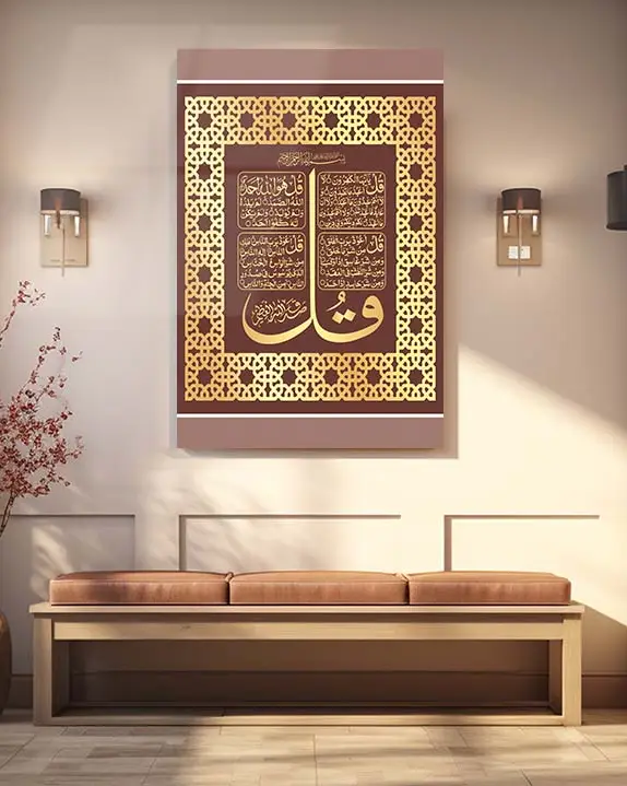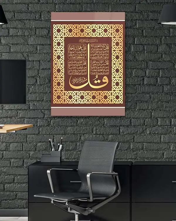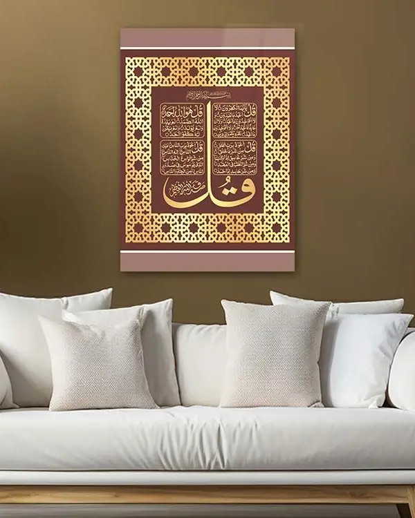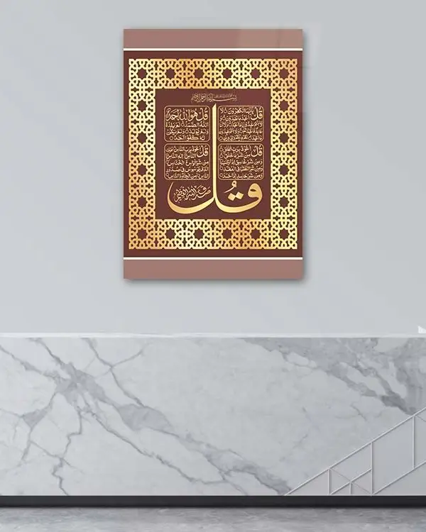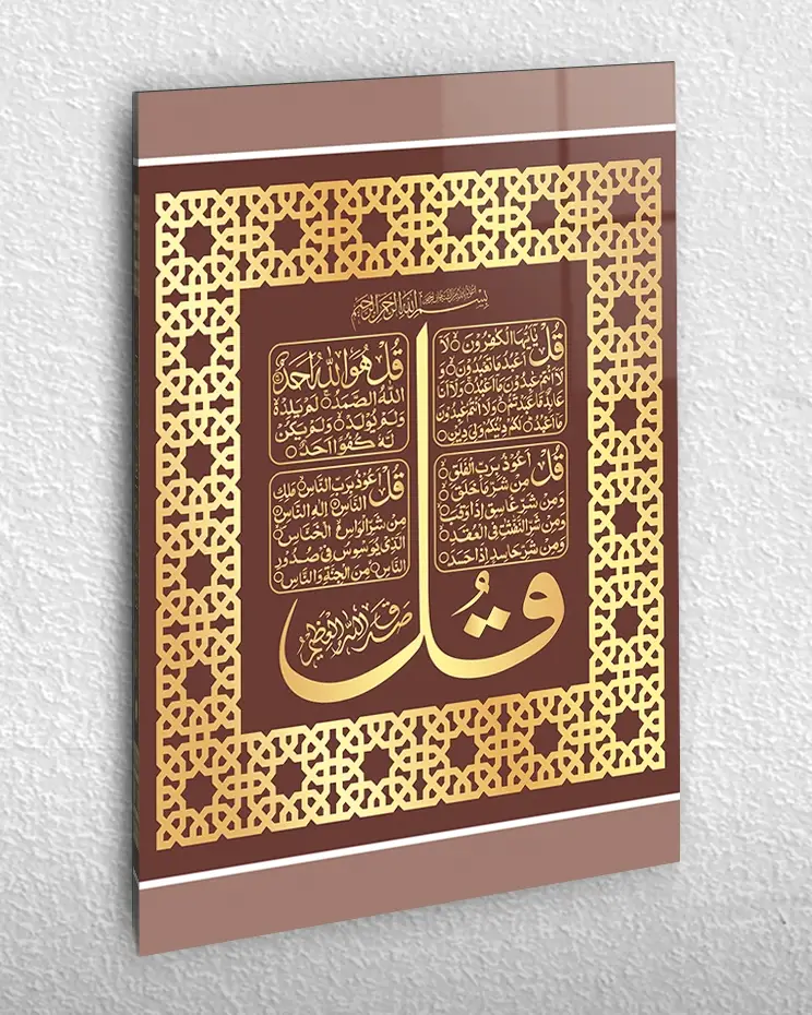 Dört Kul (4 Kul) Sureleri Yazılı Altın Renk Çerçeveli Kırılmaz Temperli Cam Tablo
