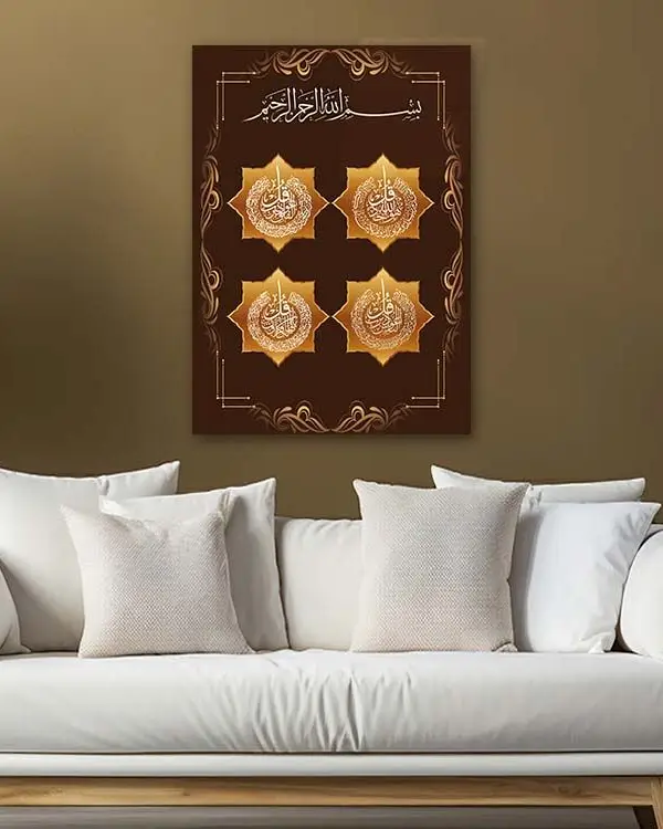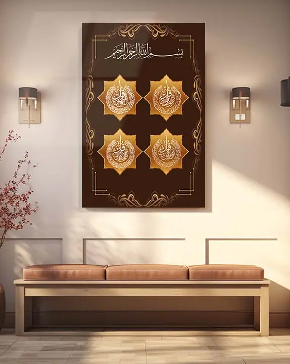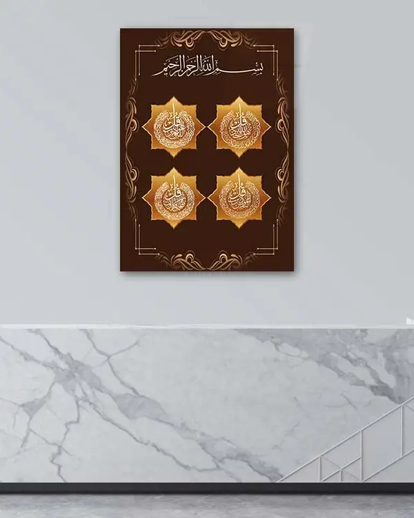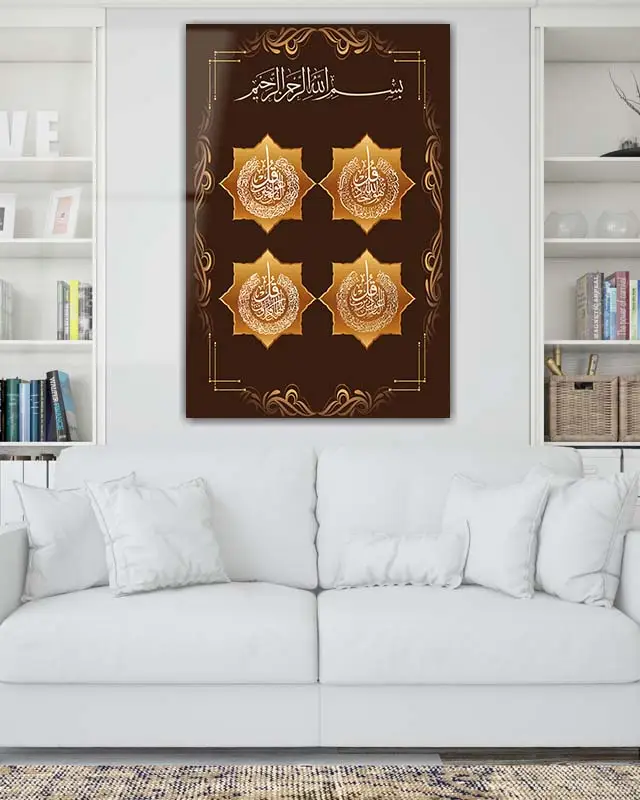 Dört Kul Sureleri Altın Motifli Kahverengi Kırılmaz Temperli Cam Tablo