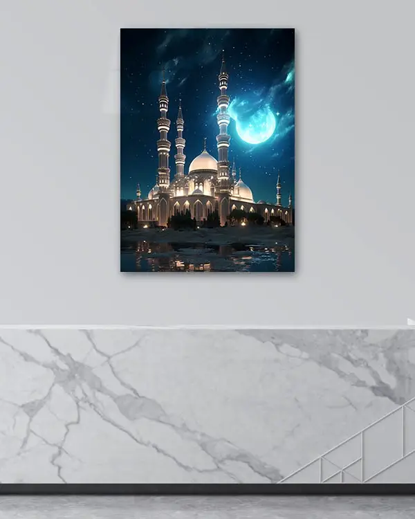 Gece Işıltısında Cami ve Ay Kırılmaz Temperli Cam Tablo