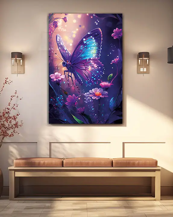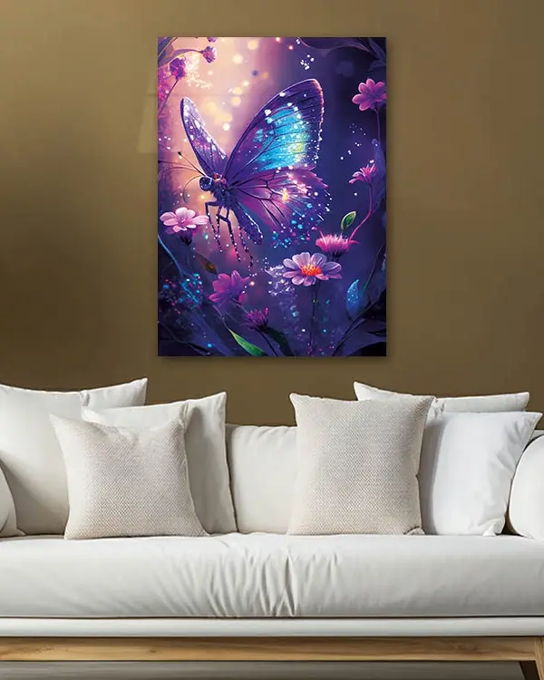 Gece Parlayan Mavi Kelebek Temperli Cam Tablo
