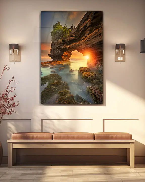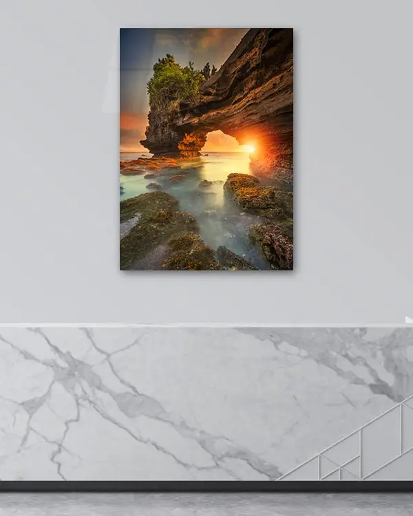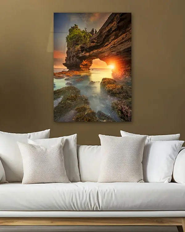 Kayalıklar Arasında Gün Batımı Manzarası Temperli Cam Tablo