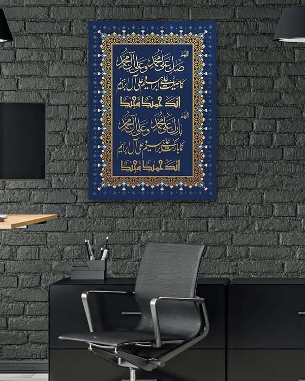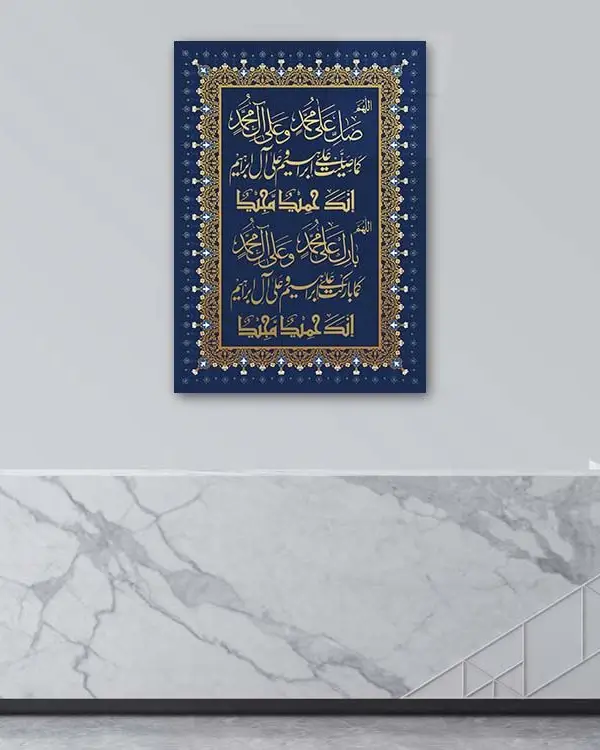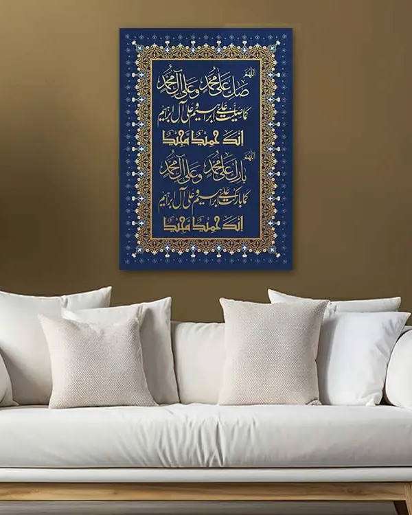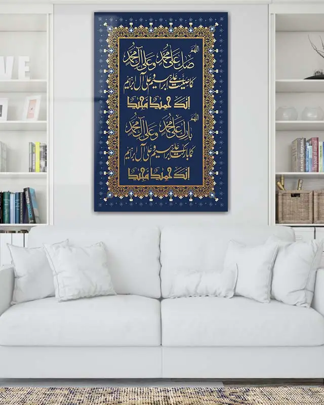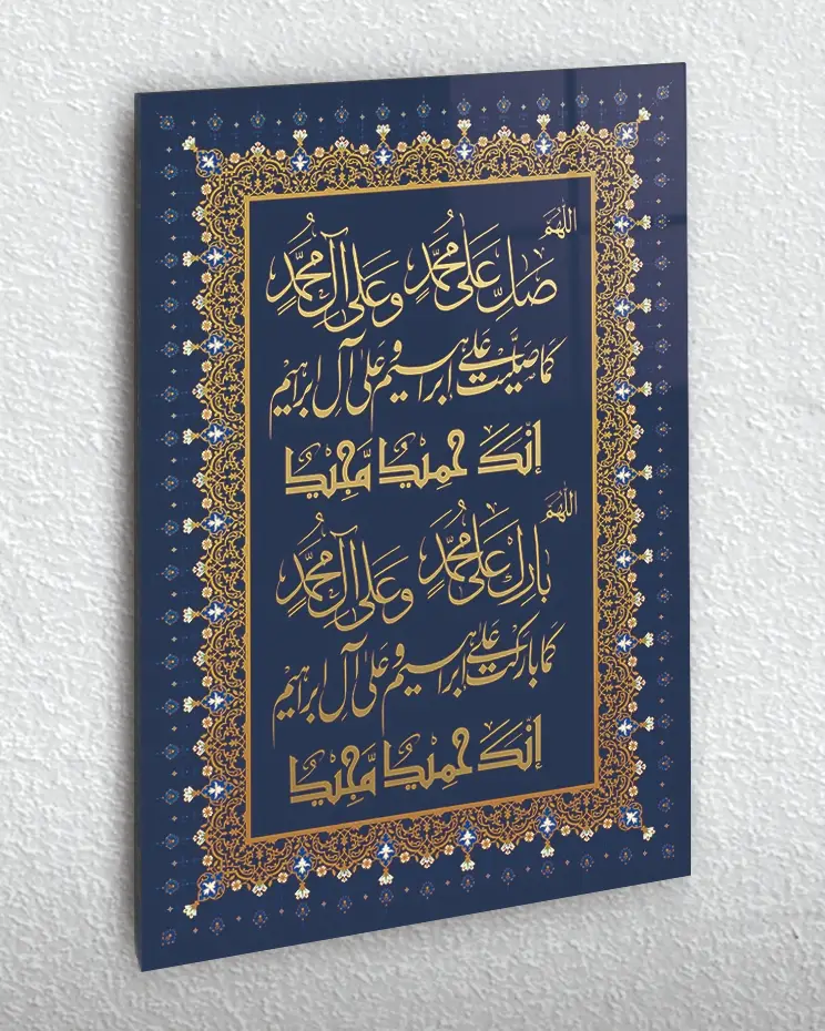 Lacivert Zemin Üzerine Altın Renkli Salavat-ı Şerife Yazılı Kırılmaz Temperli Cam Tablo