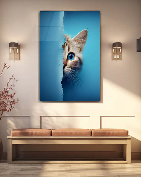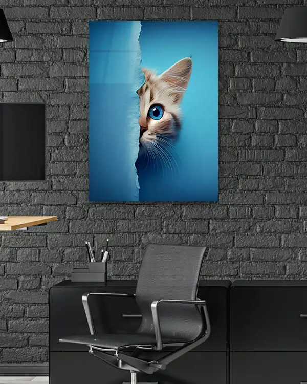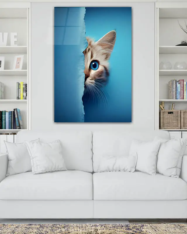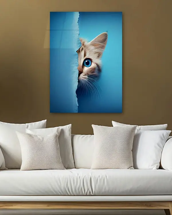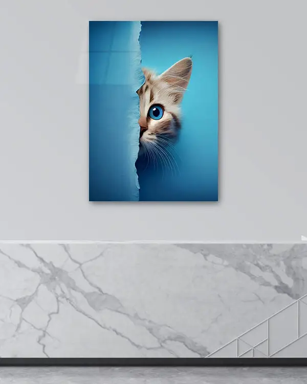 Mavi Fon Üzerinde Meraklı Kedi Temperli Cam Tablo