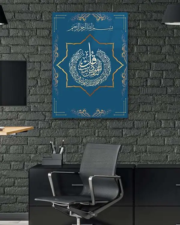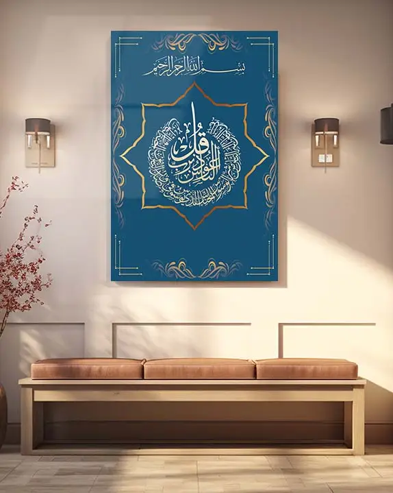 Mavi Zemin Üzerine Altın Hat Sanatı Kırılmaz Temperli Cam Tablo