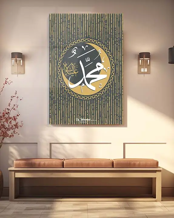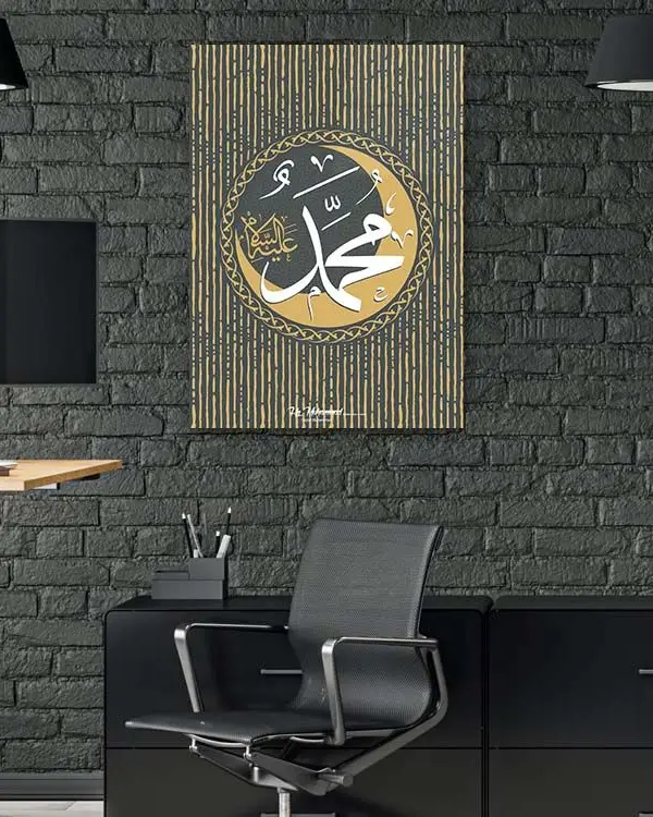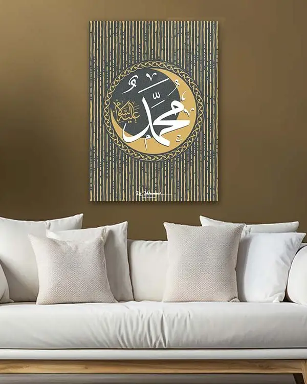Muhammed İslam Kaligrafi Kahverengi ve Altın Çizgili Kırılmaz Temperli Cam Tablo