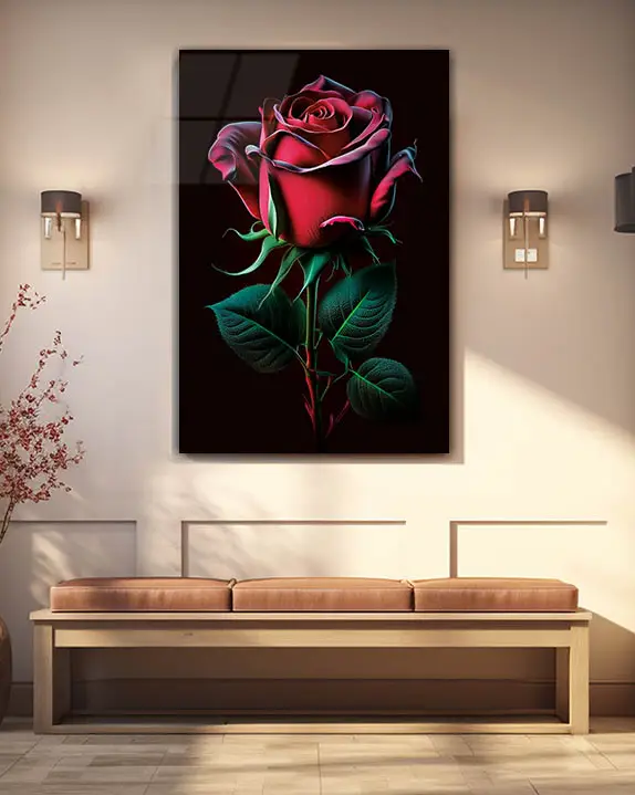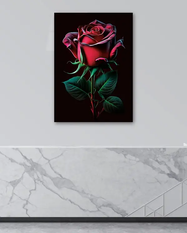 Mavi Çerçevede Kırmızı Gül Temperli Cam Tablo