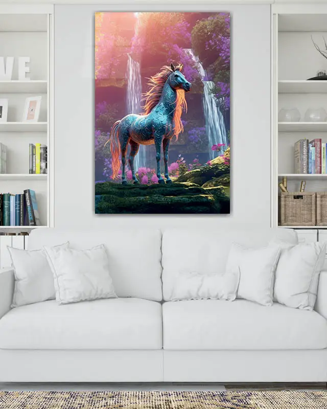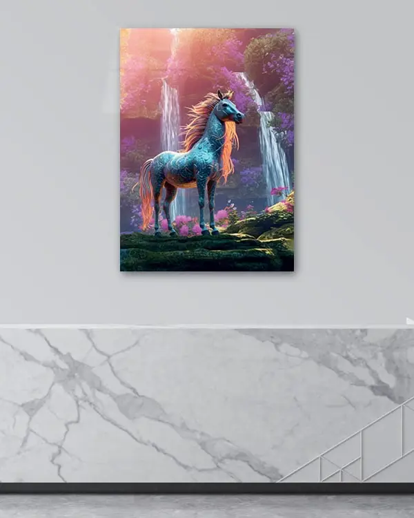Şelale Önünde At Figürü Temperli Cam Tablo