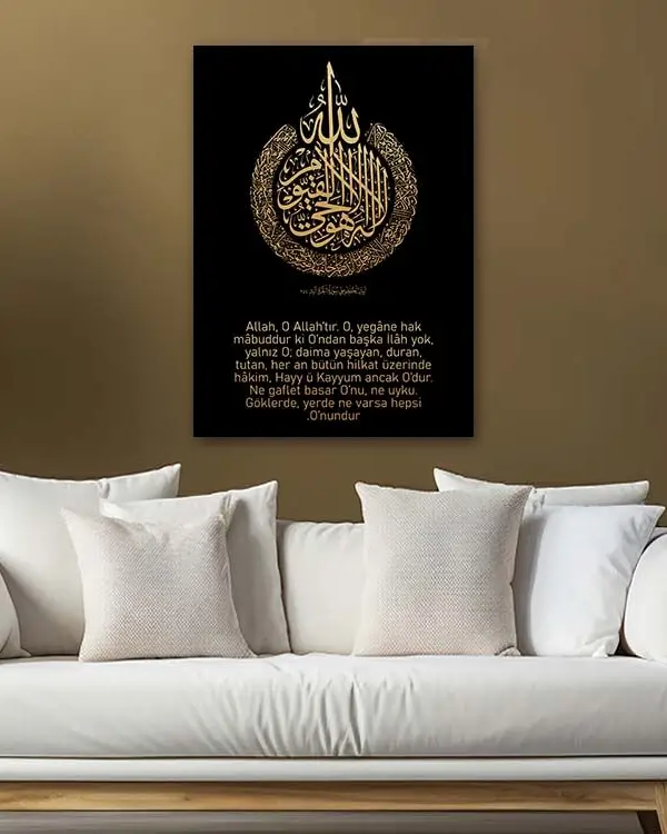 Siyah Zeminli Altın Hatlı Ayet-el Kürsi Kırılmaz Temperli Cam Tablo