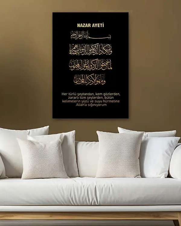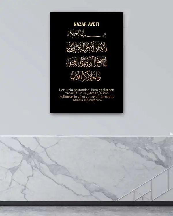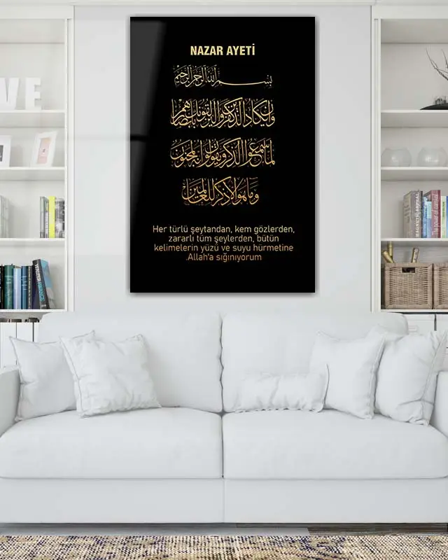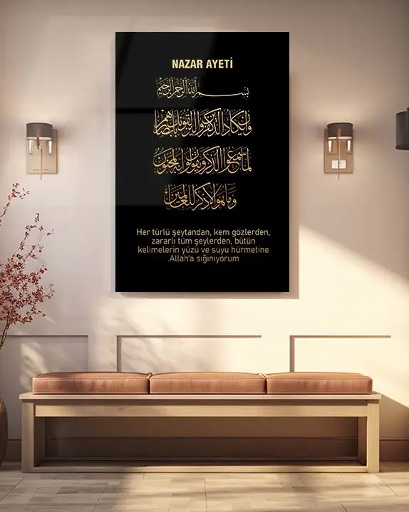 Siyah Zeminli Altın Yazılı Nazar Ayeti Kırılmaz Temperli Cam Tablo