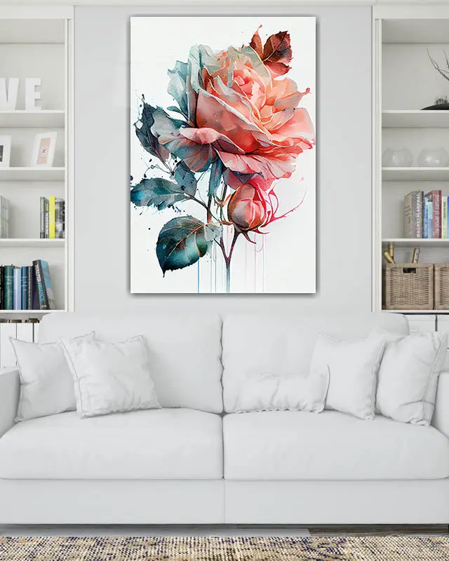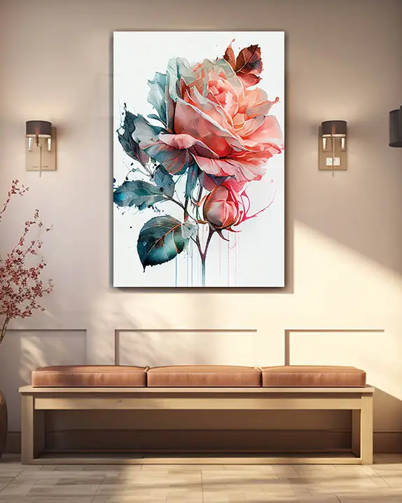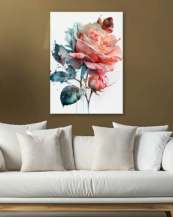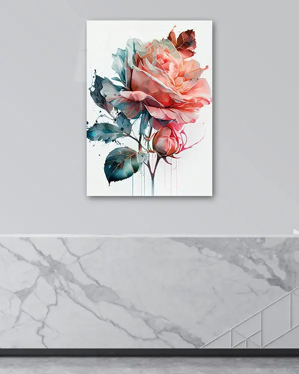 Suluboya Tarzı Pembe Gül Desenli Temperli Cam Tablo