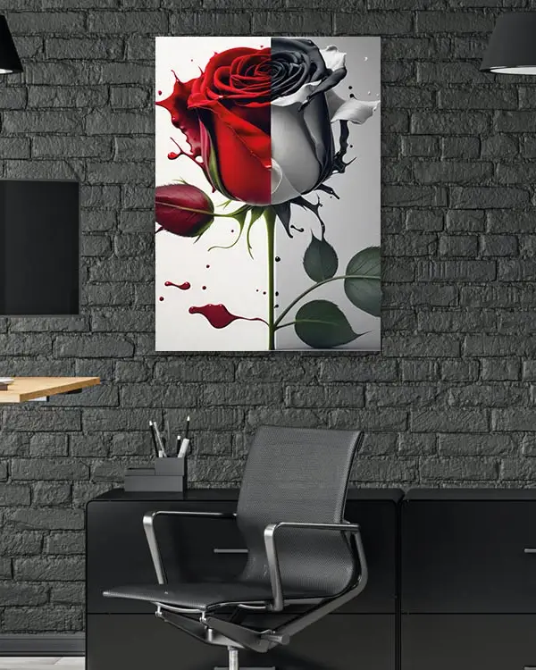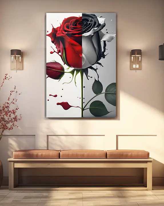 Yarı Kırmızı Yarı Siyah-Beyaz Gül Temperli Cam Tablo